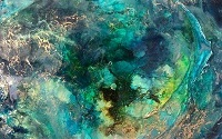 Mixed-media including 24 carat gold leaf, copper, diamantes and Swarovski crystals. Activated, pigmented resin layers on metal